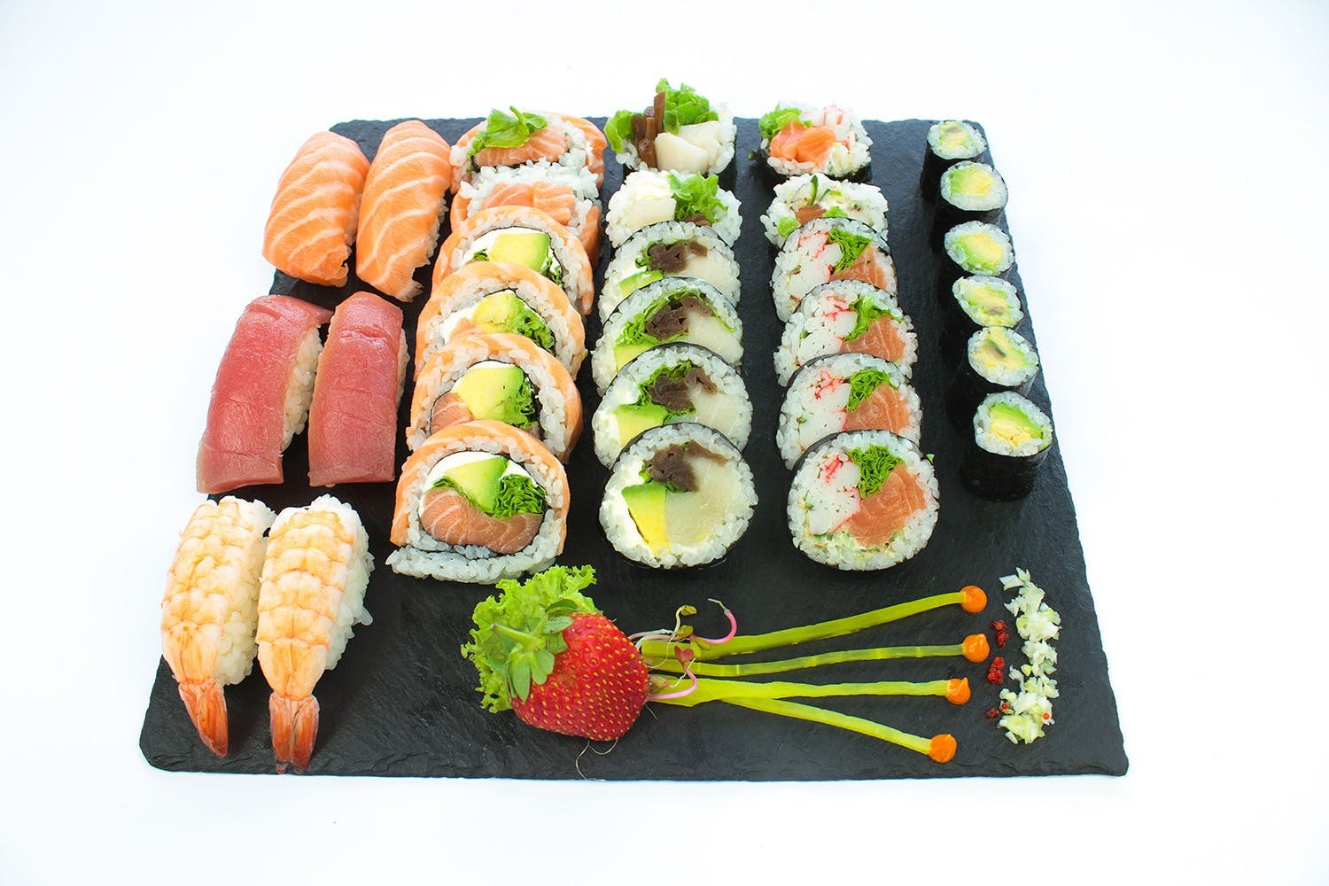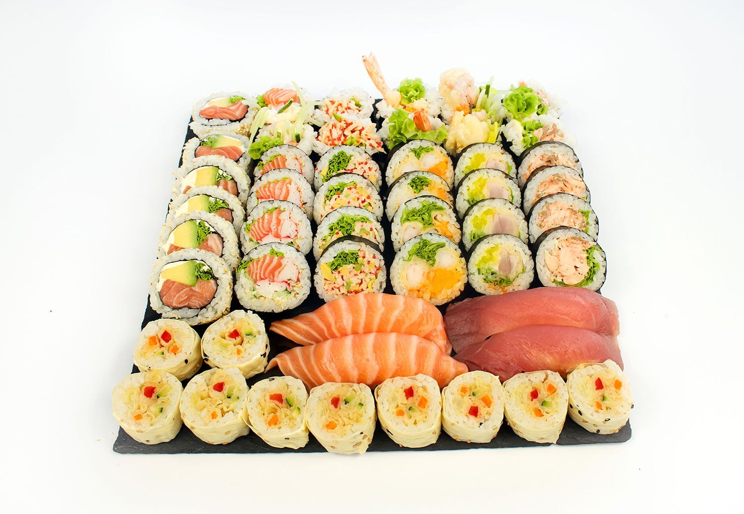Maki bez ryżu w słodkim omlecie, z łososiem, sałatką z surimi i awokado oraz krewetkami w tempurze -