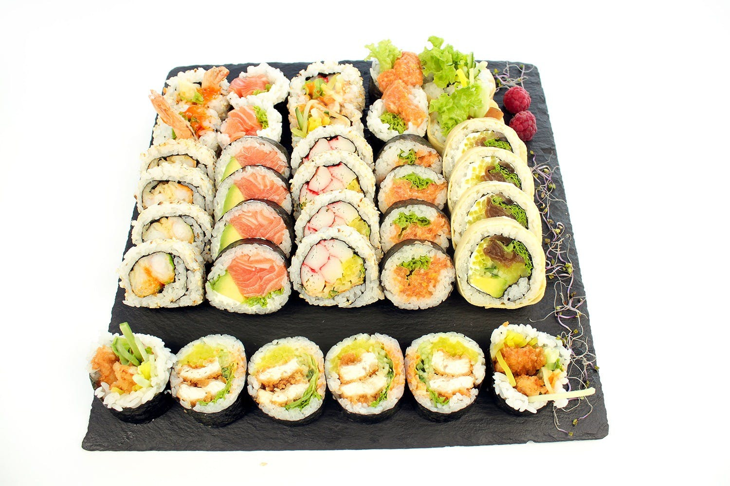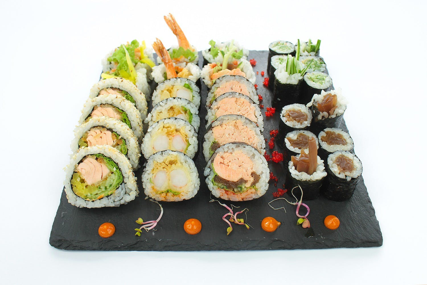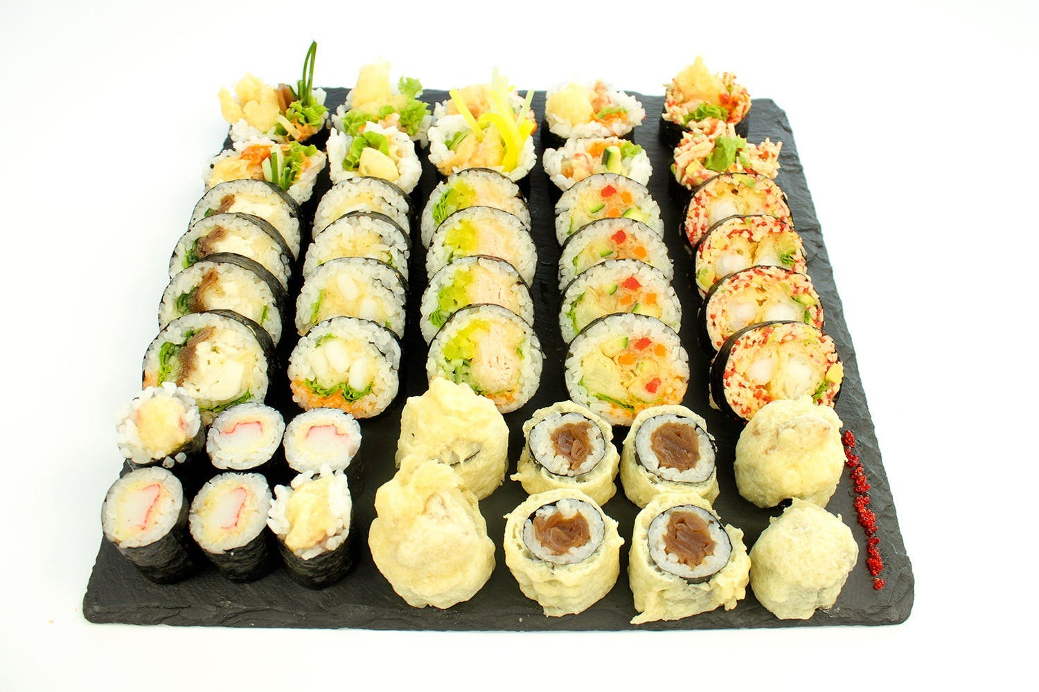 Łosoś w tempurze, warzywa, rolka obsypana kawiorem -